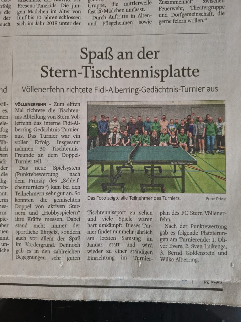 Der FC Stern richtete dieses Jahr wieder erfolgreich das Fidi-Alberring-Gedächtnis-Turnier in der Sporthalle Völlenerfehn aus. Insgesamt nahmen 30 Teilnehmer am Turnier teil. Hier ein paar Einblicke und den Zeitungsartikel des General Anzeigers.